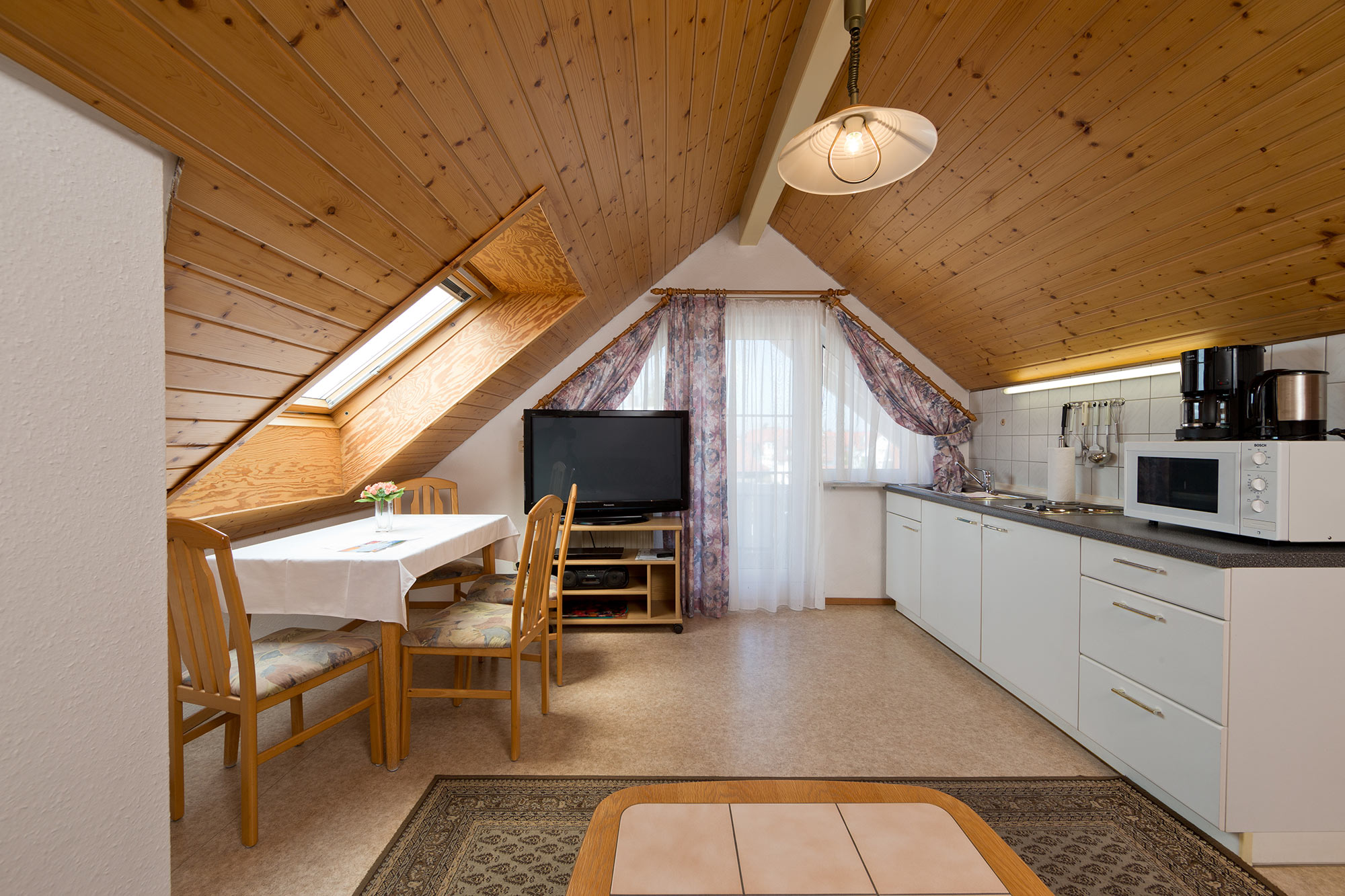 • komfortable 3 Sterne Ferienappartements• komplett eingerichtete Kombiküche mit gemütlicher Sitzecke und gepolsterten Stühlen