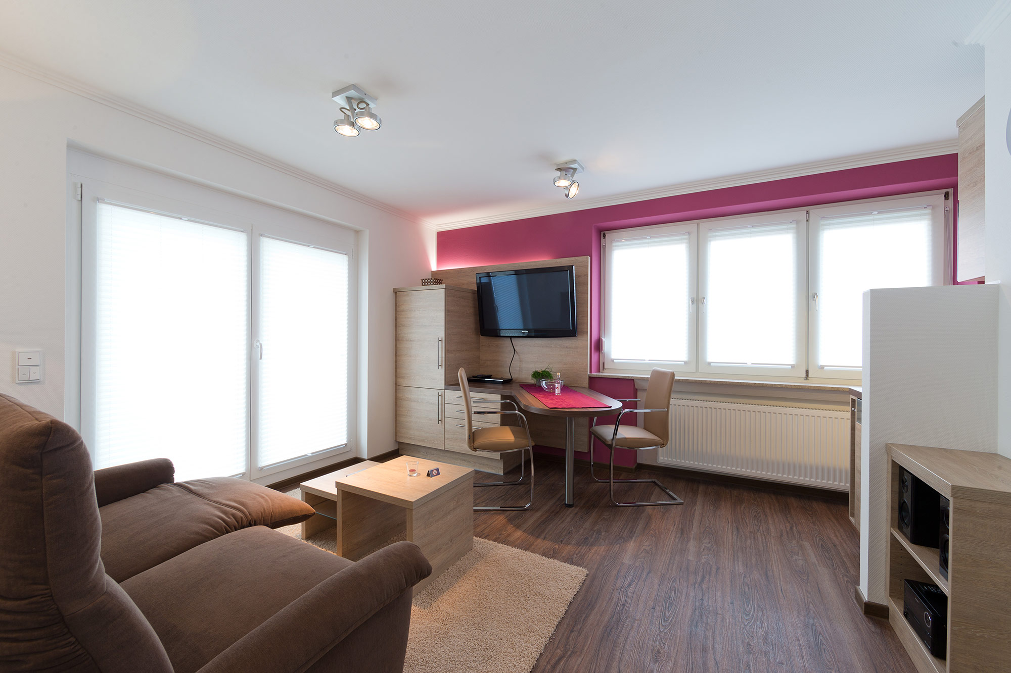 Die Wohnung „Rorschach“ hat einen großen Balkon nach Osten, welcher schon früh am Morgen mit Sonne vor dem Schlaf- und dem Wohnzimmer lockt. Das Schlafzimmer ist mit zwei Einzelbetten ausgestattet.Größe 41 qm / Etage 1.OG / Ausrichtung Süd-Ost
