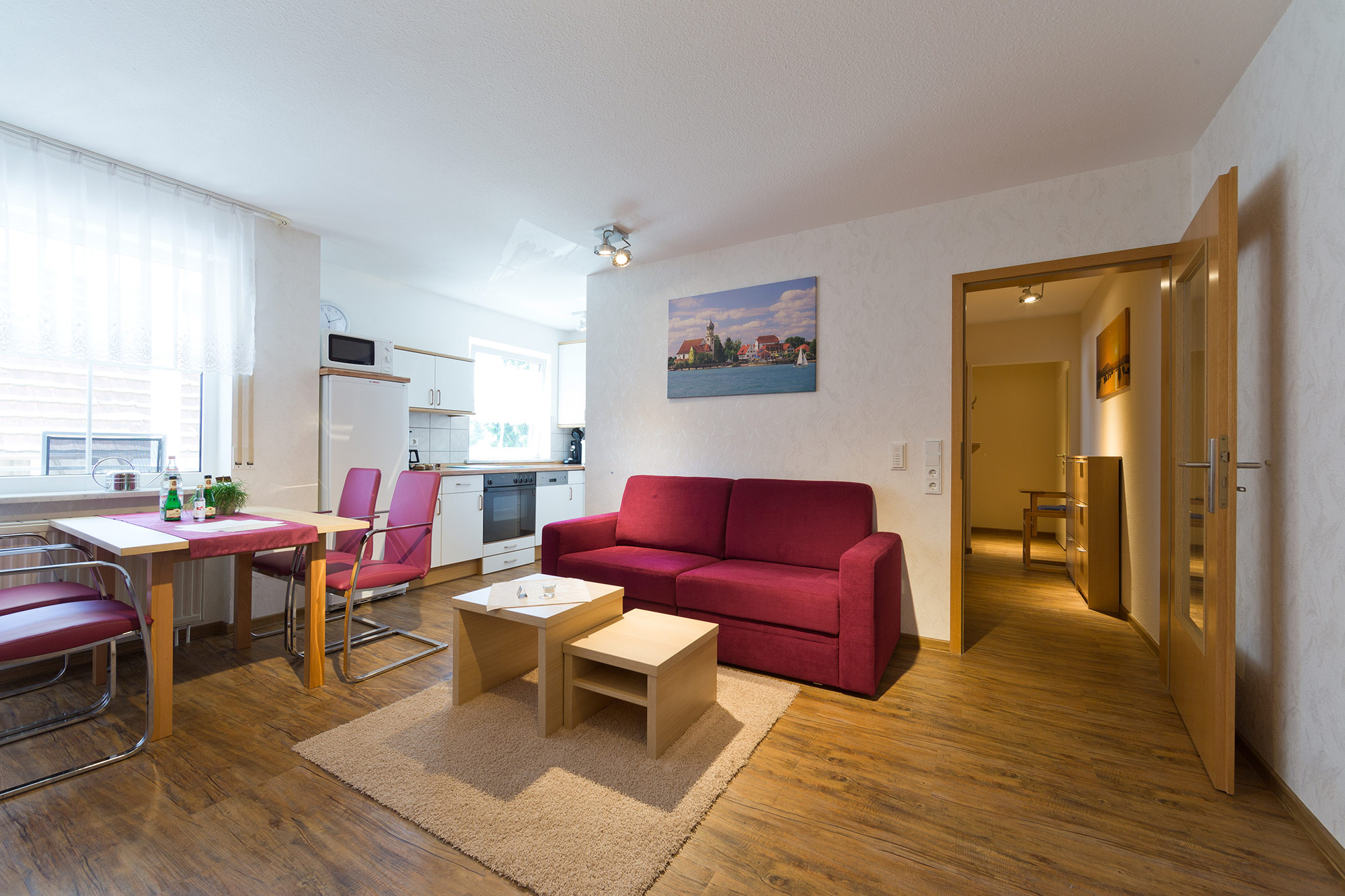Die Wasserburg ist unsere größte Wohnung und bietet mit zwei Balkonen auch im Freien ausreichend Platz! Das großzügige Wohnzimmer mit offener Kochnische ist prima für gesellige Abende geeignet.Größe 52 qm / Etage 1. OG / Ausrichtung Osten
