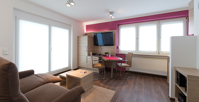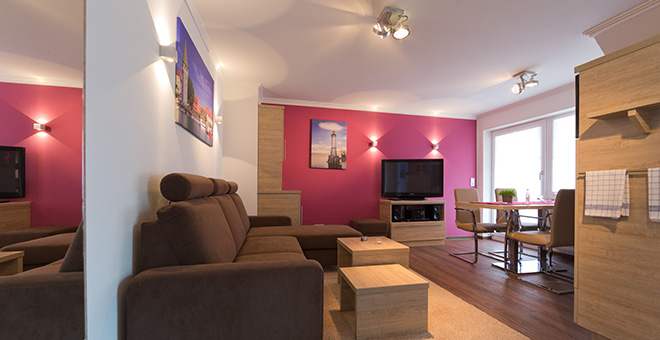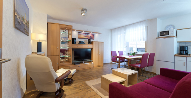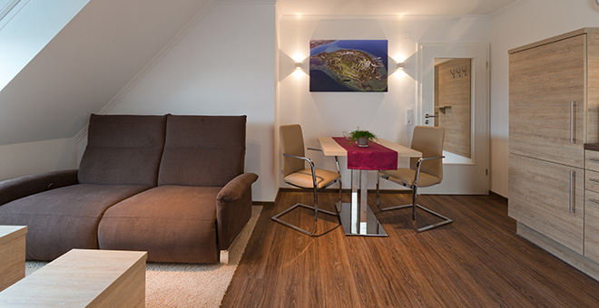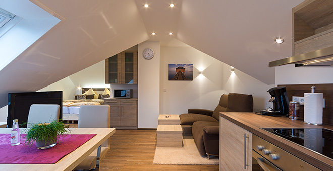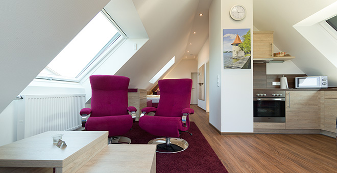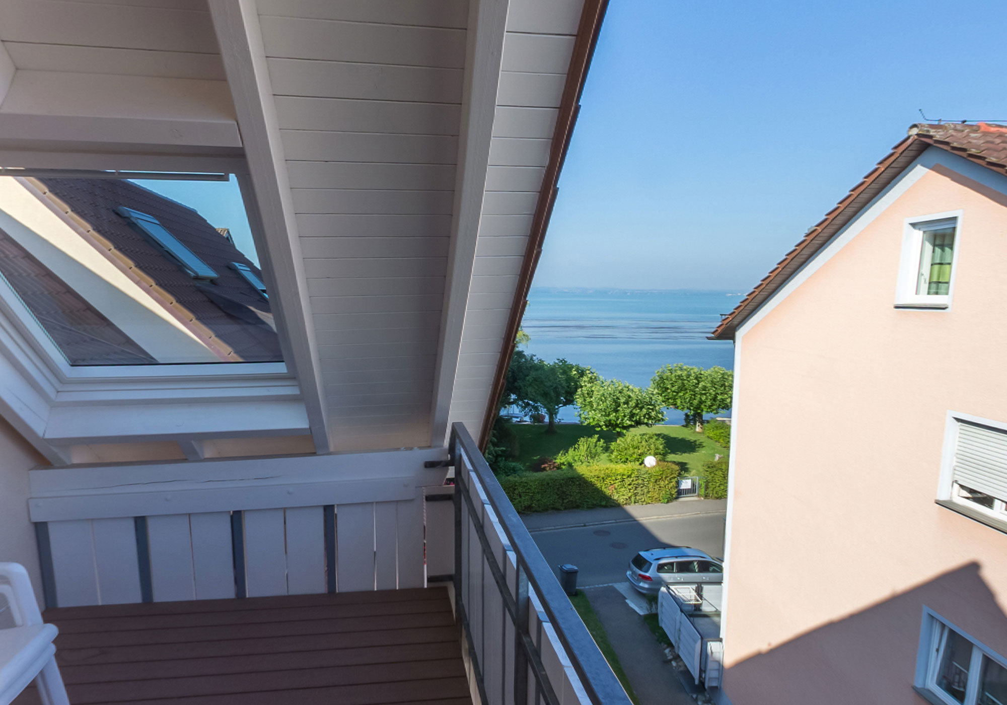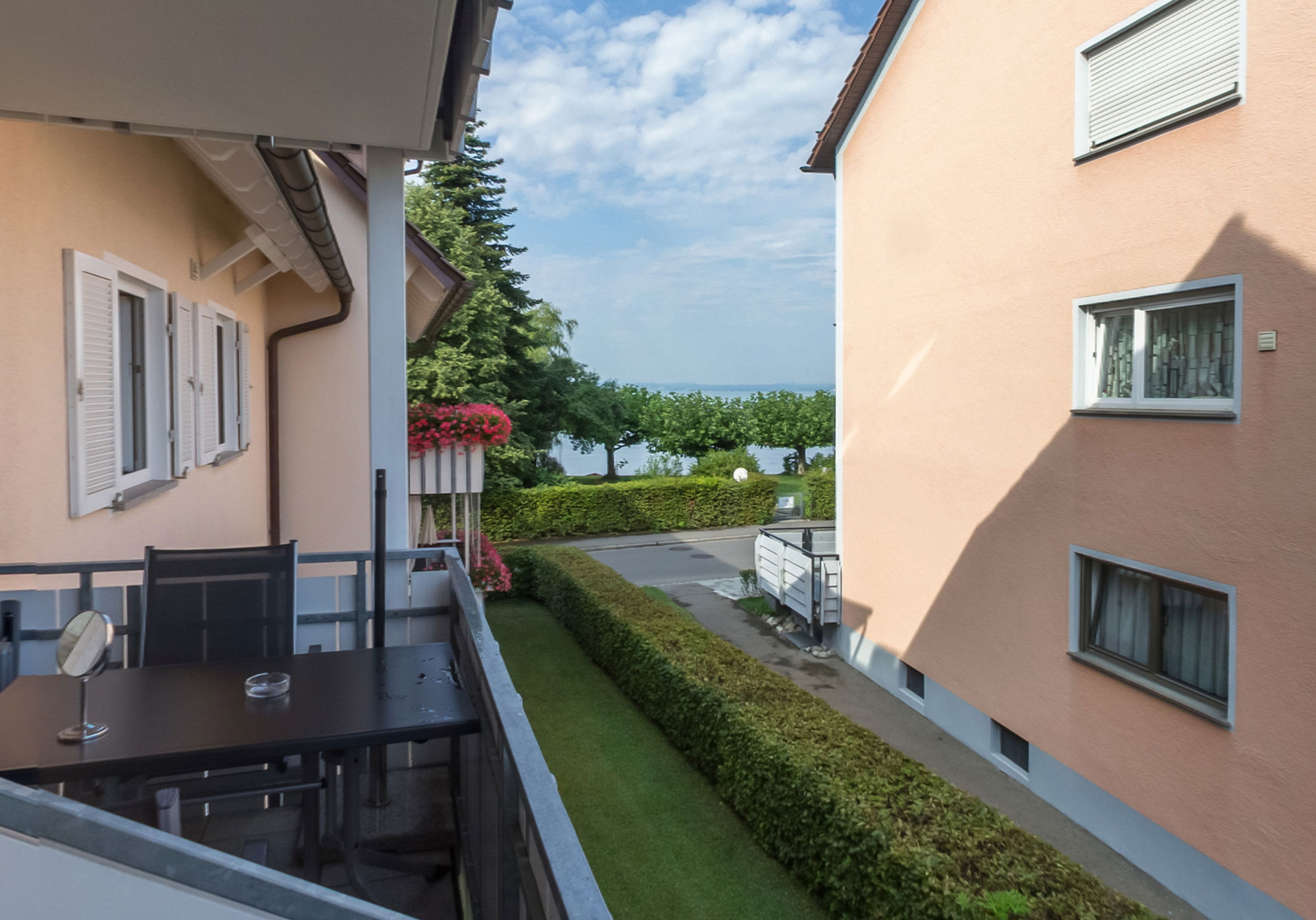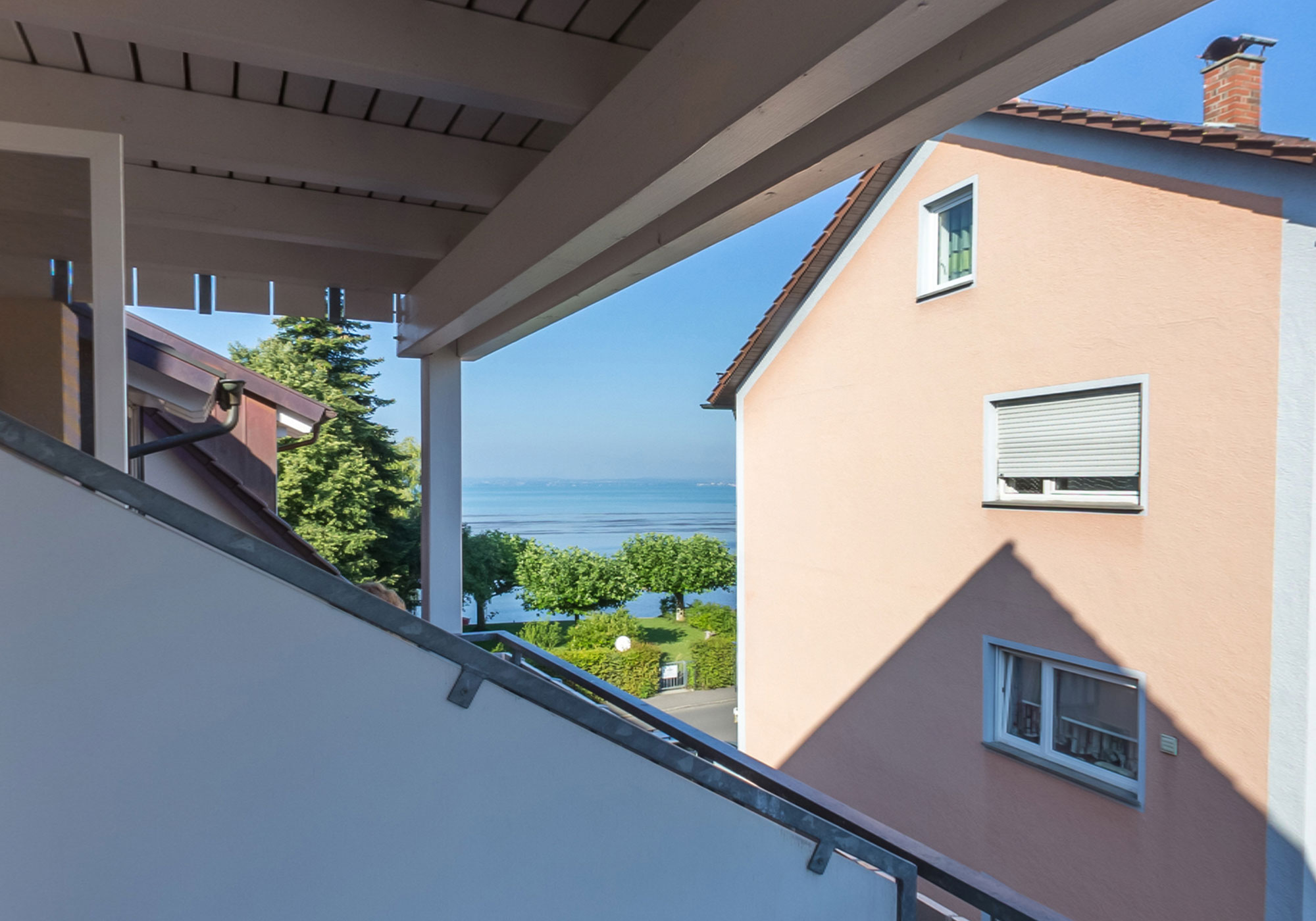 Über das hintere Treppenhaus gelangen Sie in die fünf komfortablen und gemütlich eingerichteten Ferienappartements mit Blick zum See. Preise pro Nacht zwischen 90,- und 105,- Euro (Hauptsaison).